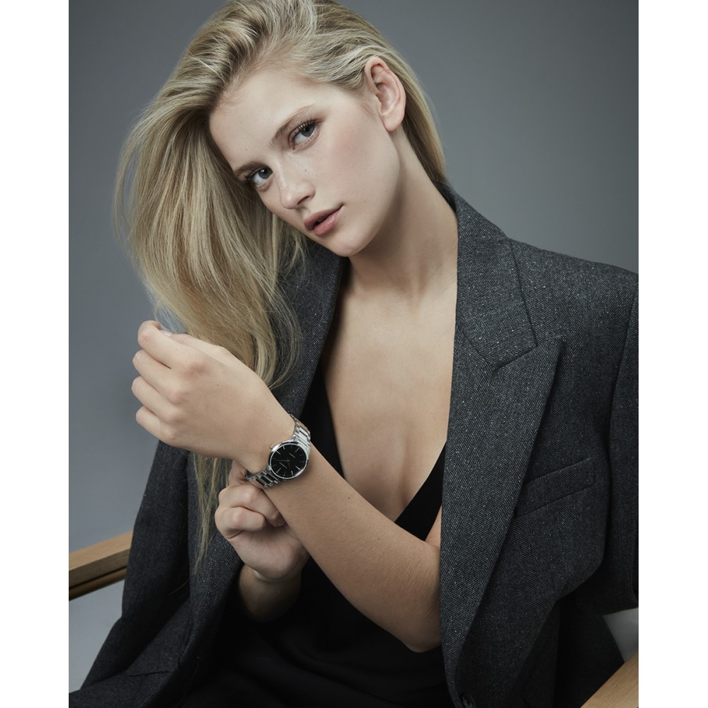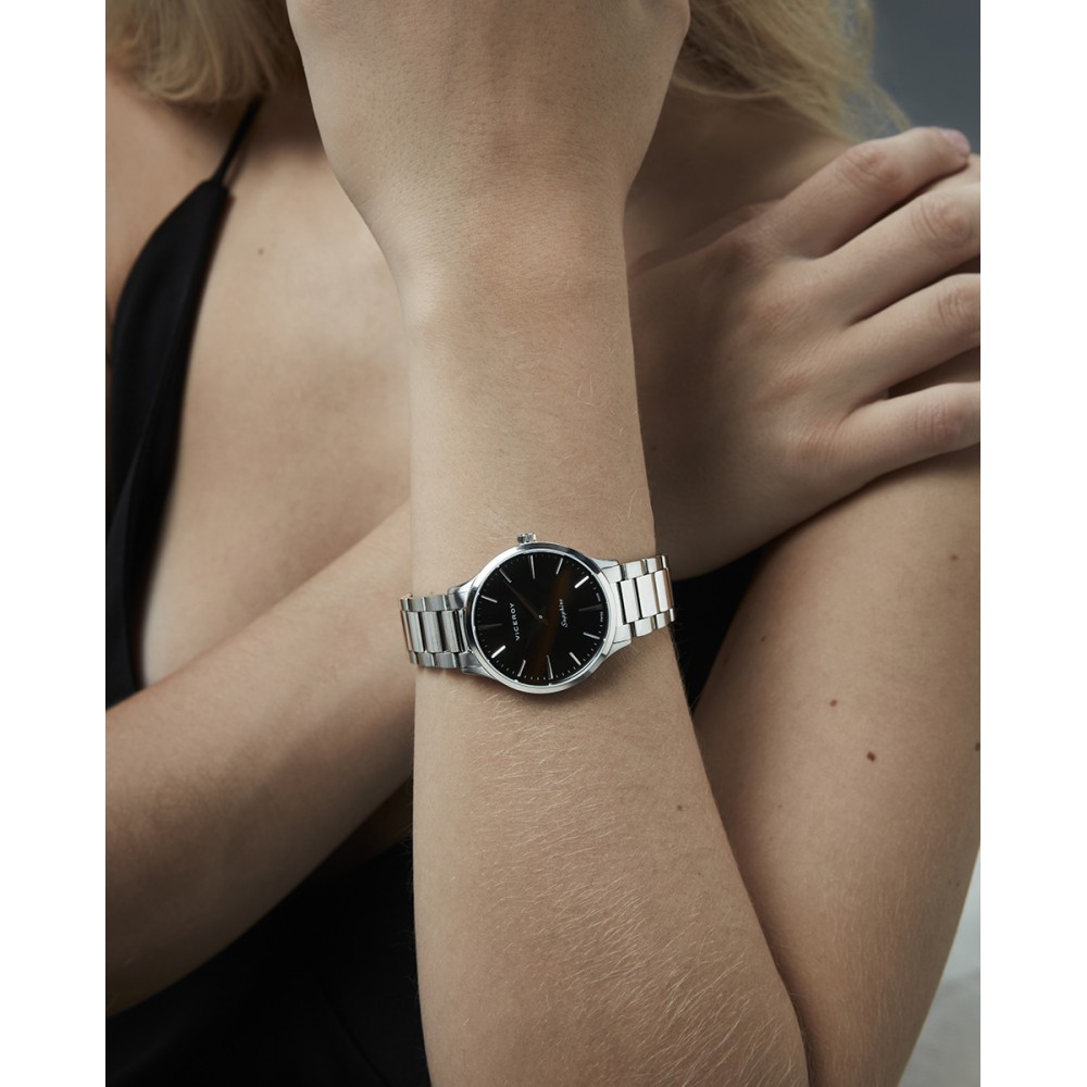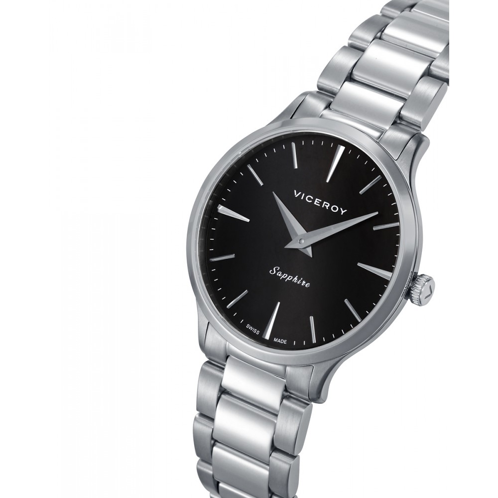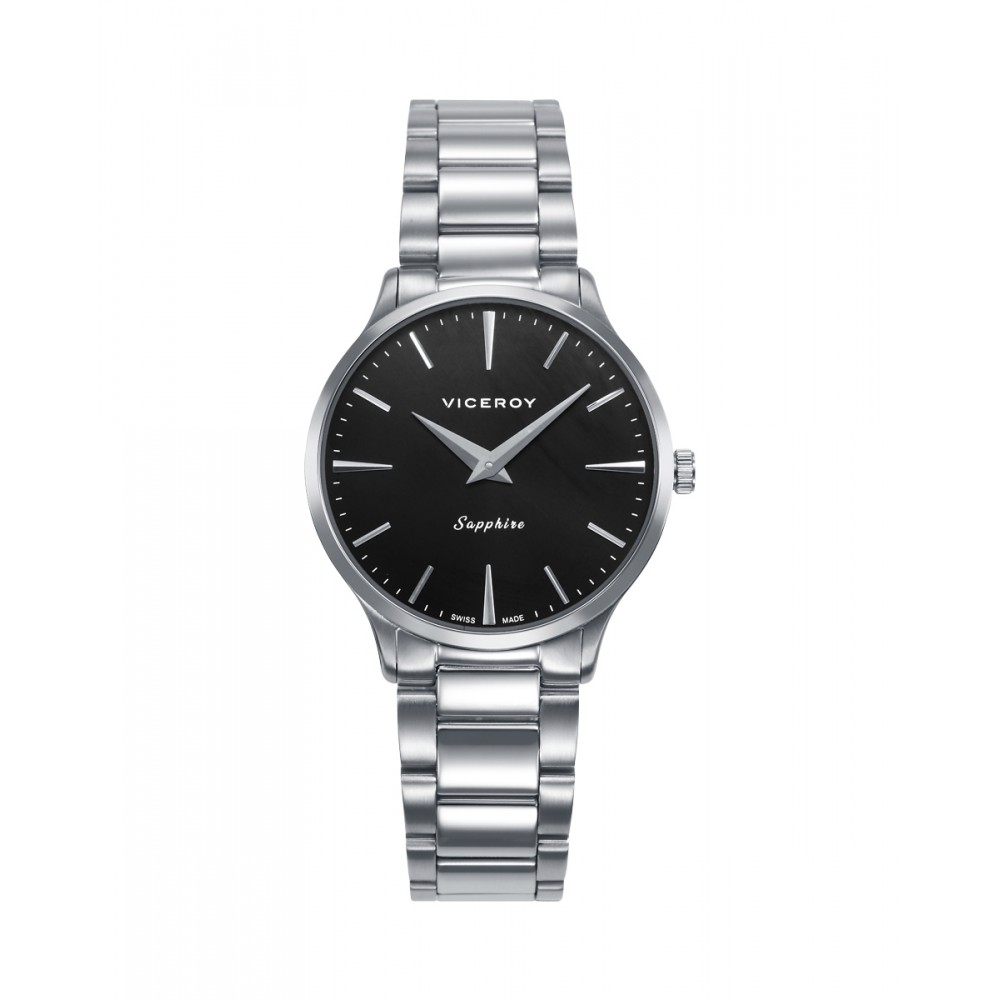 Distinguido reloj de mujer Swiss Made con movimiento de dos agujas y un diseño sobrio y elegante. Su caja de acero con resistencia 5 ATM y el brazalete sólido desmontable ofrecen versatilidad. La esfera negra con índices y agujas plateadas, protegida por cristal de zafiro, combina precisión suiza y estilo atemporal al más puro Viceroy.