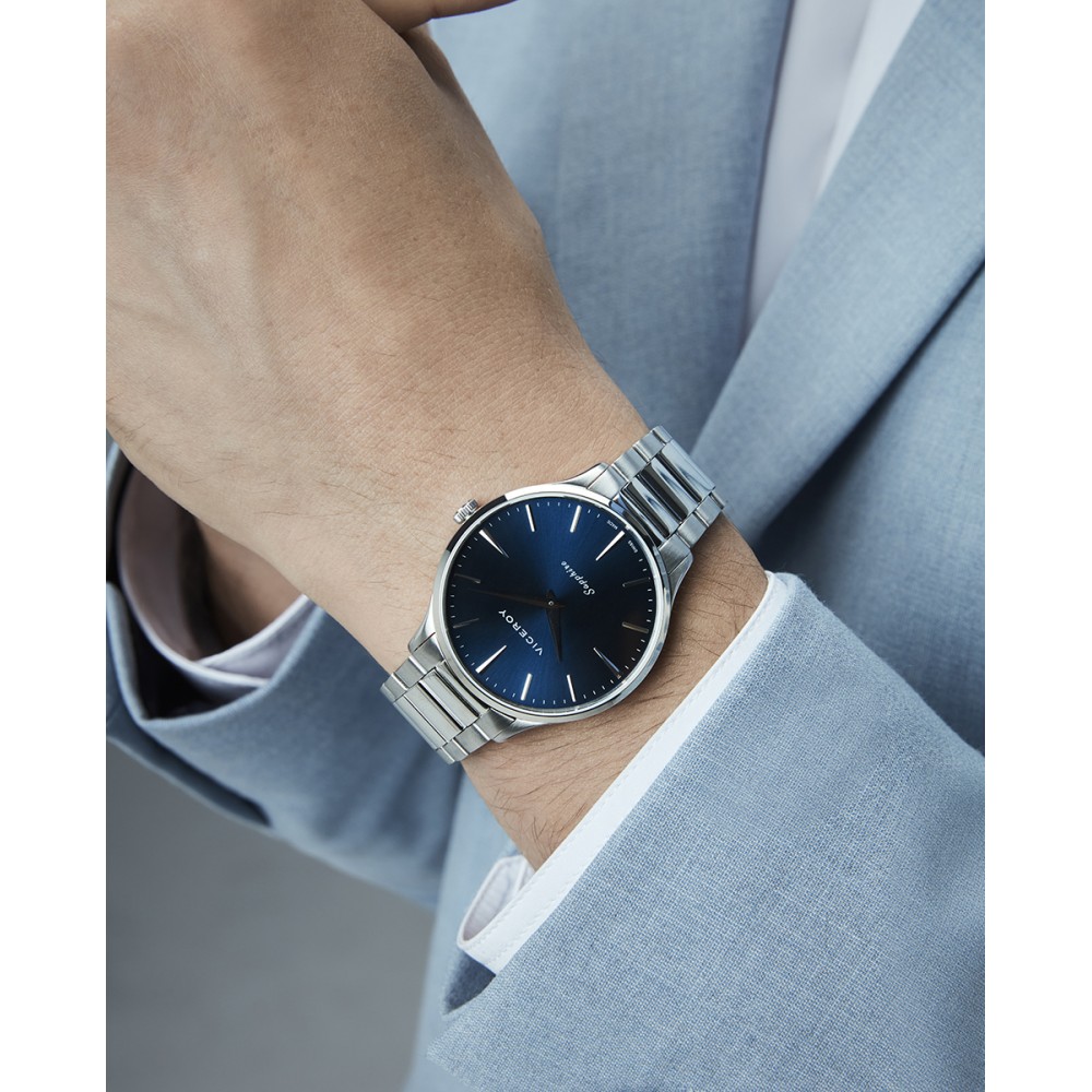 Funcional reloj de hombre Swiss Made con movimiento de dos agujas y diseño elegante. Su caja de acero resistente al agua 5 ATM y cristal de zafiro aseguran durabilidad y precisión. La esfera azul con índices y agujas plateadas aporta un toque moderno, mientras que el brazalete sólido desmontable ofrece versatilidad con el sello Viceroy.