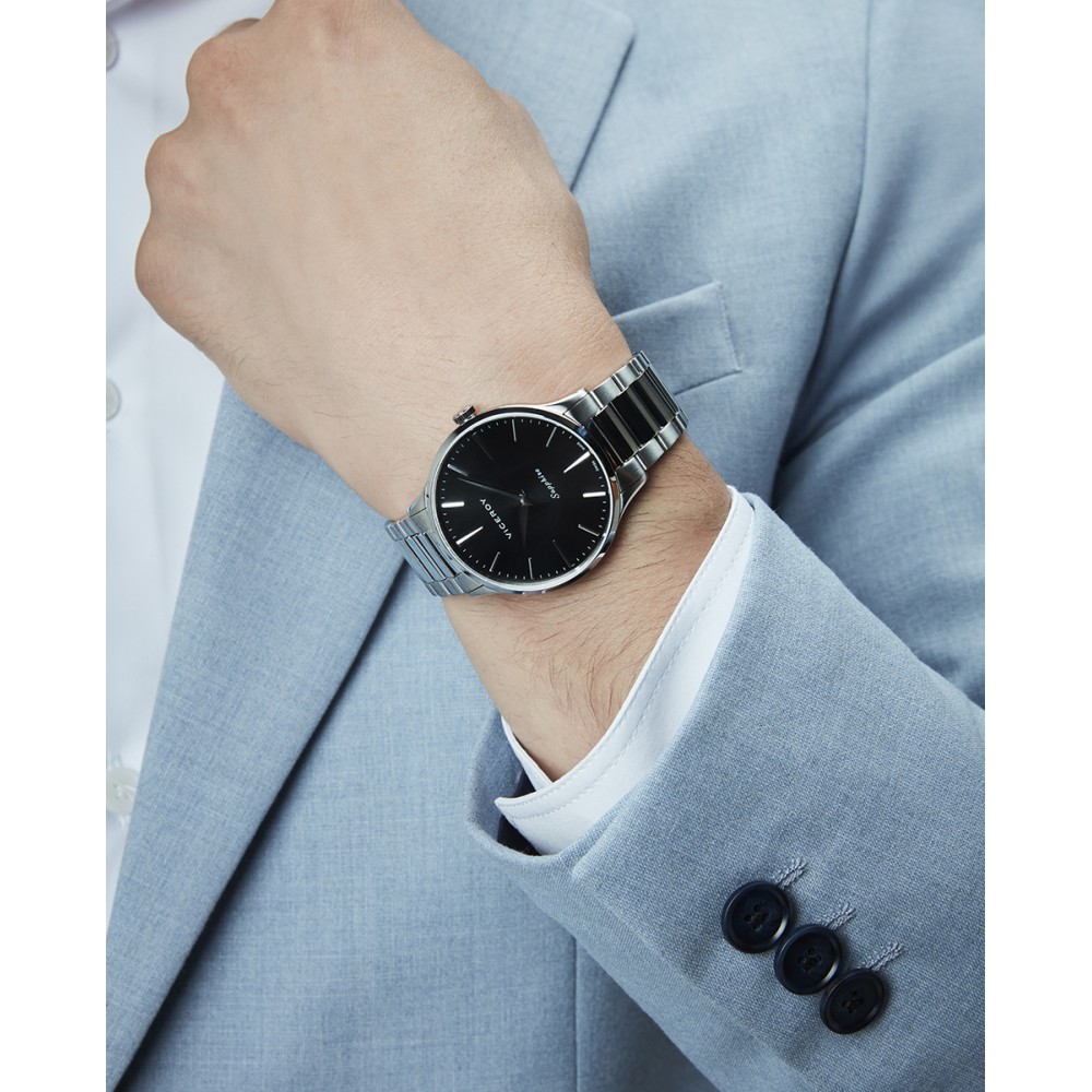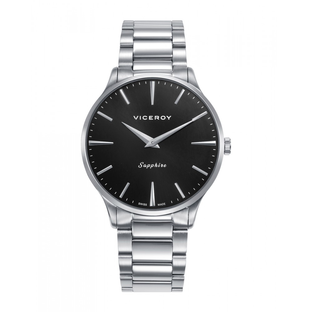 Original reloj de hombre Swiss Made con diseño de dos agujas y un estilo sobrio y atemporal. Su caja de acero con resistencia al agua 5 ATM y cristal de zafiro garantizan precisión y durabilidad. La esfera negra con índices y agujas plateadas aporta elegancia, mientras que el brazalete sólido desmontable ofrece versatilidad con el sello Viceroy.