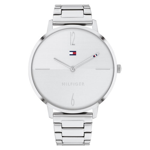 Reloj 2 agujas, caja de 40mm de acero inoxidable esfera plateada. Brazalete de eslabones en acero inoxidable. 3 ATM.