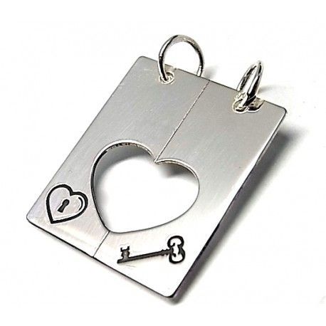Colgante plata de ley 925 liso chapa corazón y llave partido de 2 cm ancho x 2.5 cm largo .