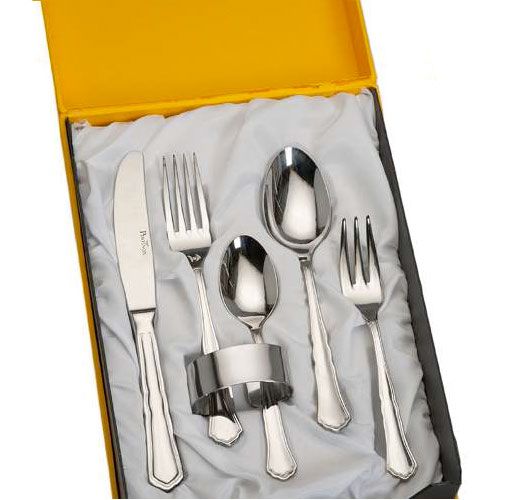Consta de 6 piezas, cuchillo, tenedor, cuchara, tenedor poste, cuchara postre y sevilletero.