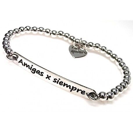 Pulsera plata de ley 925 bolas elástica con chapa rectangular mensaje amigas x siempre con motivo corazón te quiero .